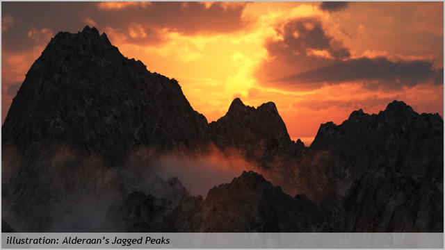 I loved the landscape of Alderaan that we were shown a brief glimpse of at the end of the movie, "Star Wars: Episode III, Revenge Of The Sith". Using my imagination in a project I created in my free time, I wanted to explore a close up of the jagged mountain peaks on the surface of Princeless Leia's home world. This painting is the end result of my effort.