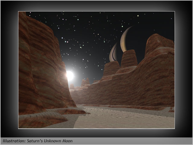 The sun rises on Saturn’s unknown moon, illuminating the sandy floor of it's three-thousand mile canyon. The moon's daytime sky remains black and the stars of the Milky Way shine bright through it's thin atmosphere. The moon is alive and calling for adventurer's to come explore it's wonders.