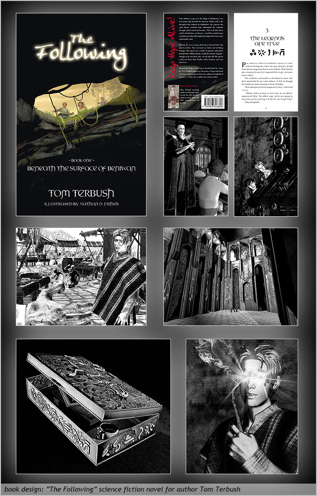 Science fiction book cover design for self-published author Tom Terbush. Also featured is the back cover, interior chapter head design/layout sample, and six interior page illustrations created by Nathan Fisher at Sci-Fi Book Cover Designer.